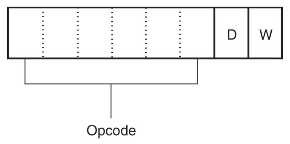 第一个操作码字节负责选择由微处理器执行的运算(比如加法、减法等。下图展示了多数指令的第一个操作码字节的一般形式: