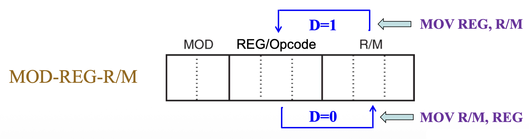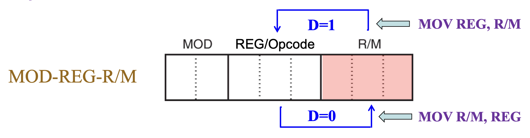 • 由于指令中最多只有一个操作数使用内存寻址Intel 设计了一个方向位来指示数据是流向 R/M(作为目的)还是从 R/M 流出(作为源,这是一个更高效且更优雅的编码方案