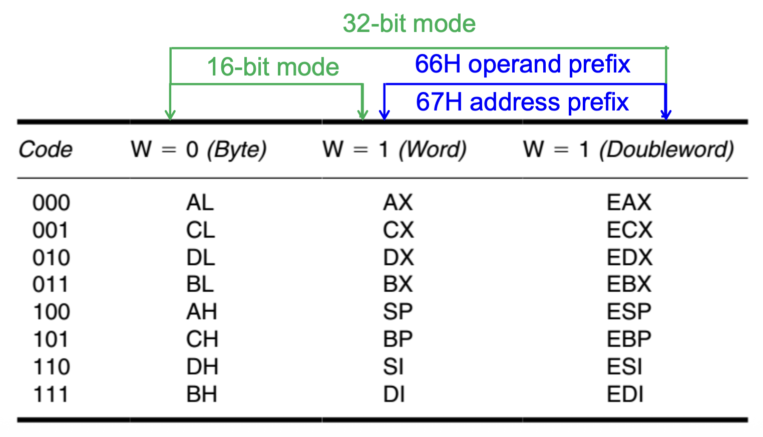 其中 W 位出现在大多数指令中,而 D 位主要出现在 MOV 指令和其他一些指令中