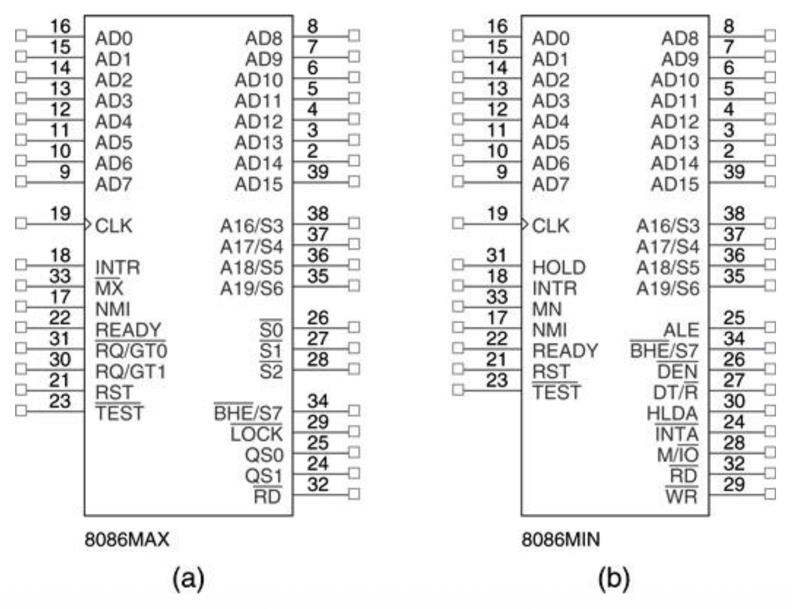 在这两种模式下的 8086 引脚排布: