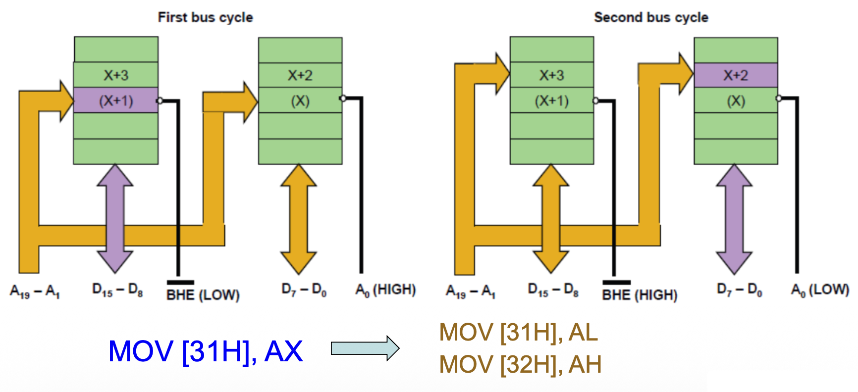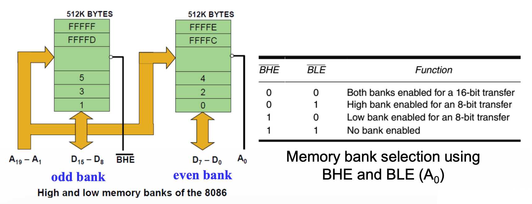 • \(\overline{\text{BHE}} = 0\) 启用高位 / 奇数位的内存库