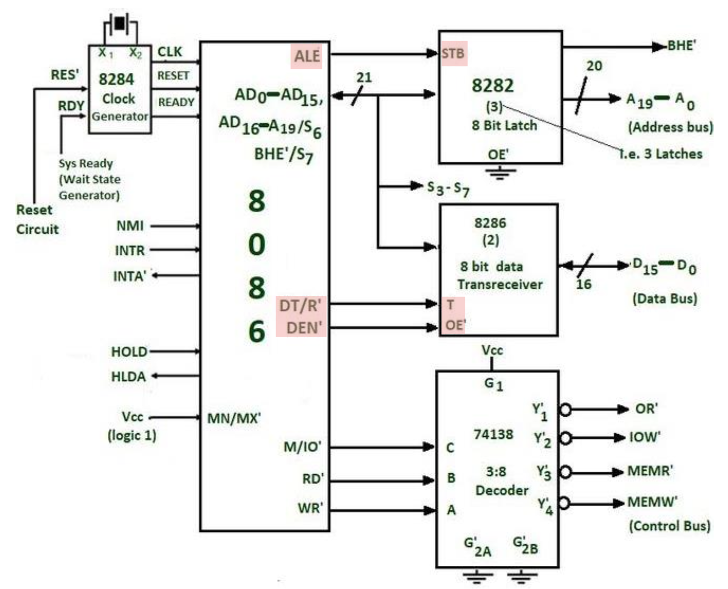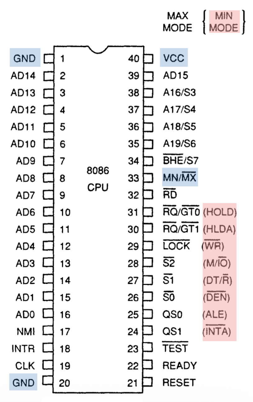 • \(\text{BHE}\):在 8086 中,总线高使能(bus high enable) 引脚用于在读或写操作期间启用最高有效数据总线位(\(\text{D}_{15}–\text{D}_8\)