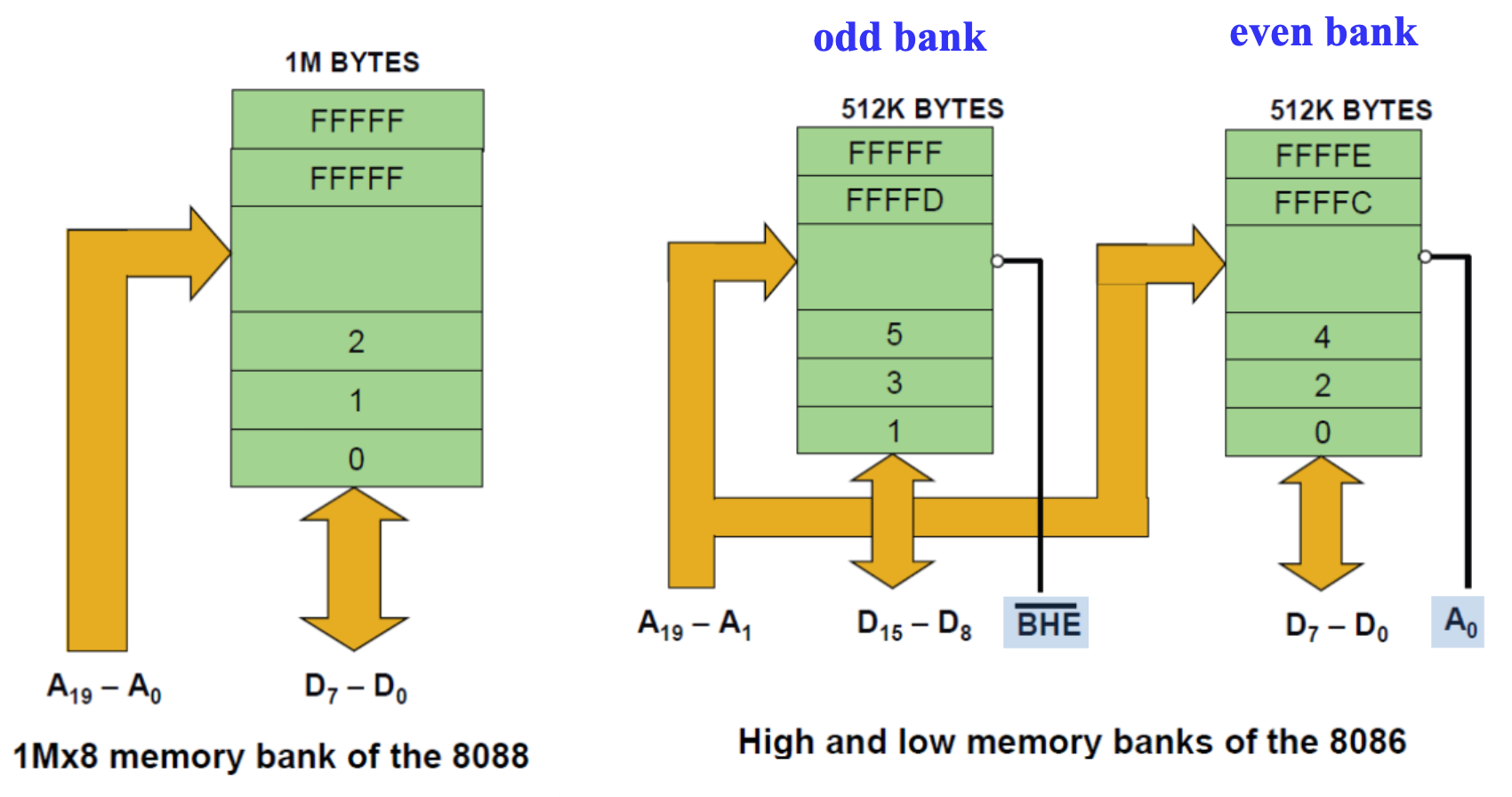 • 8086 16 位的数据总线,且内存地址空间实现为两个独立的 512 KB 内存库