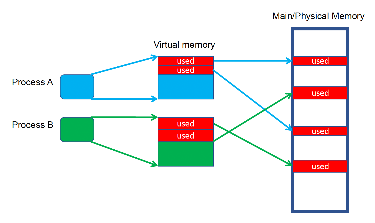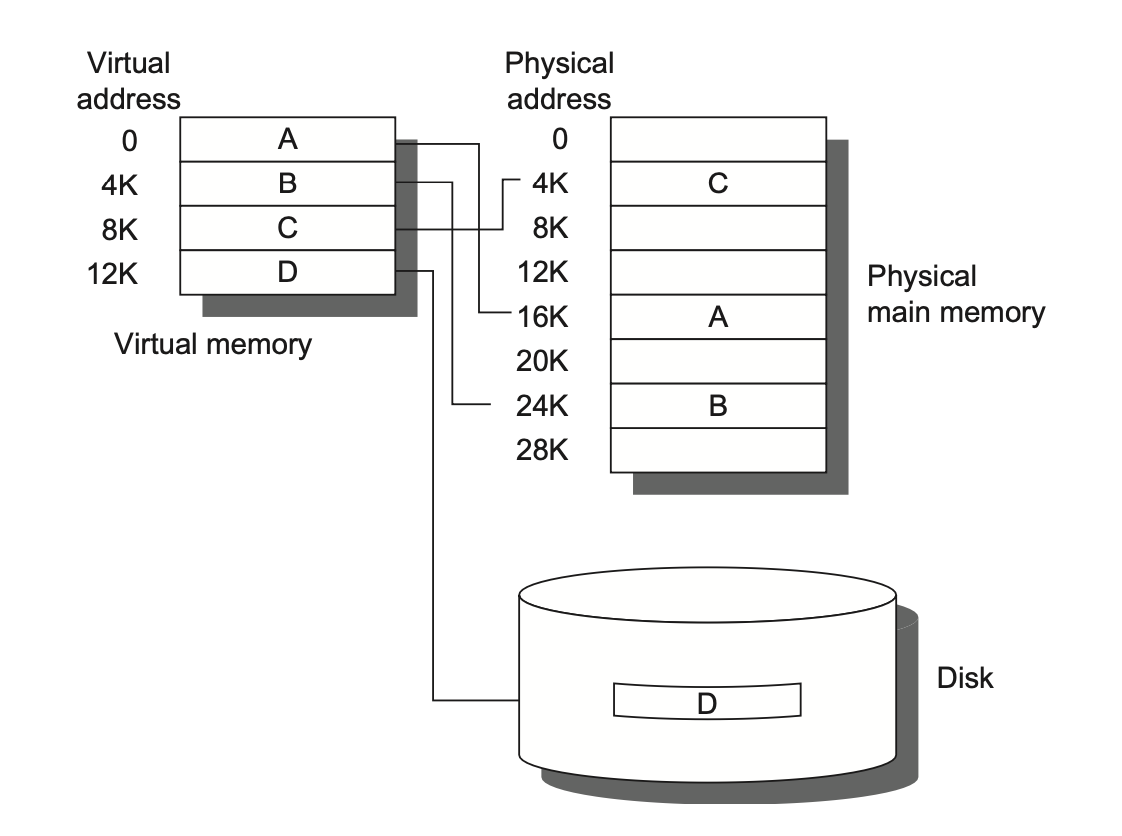 虚拟内存(virtual memory) 将物理内存划分为块,并且将其分配到不同的进程中。下图展示了虚拟地址到物理地址的映射情况: