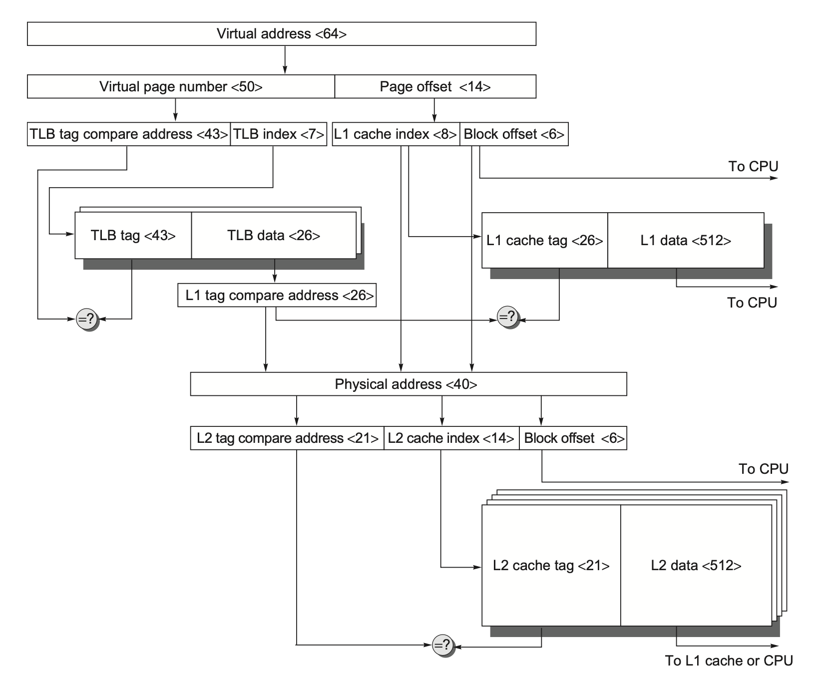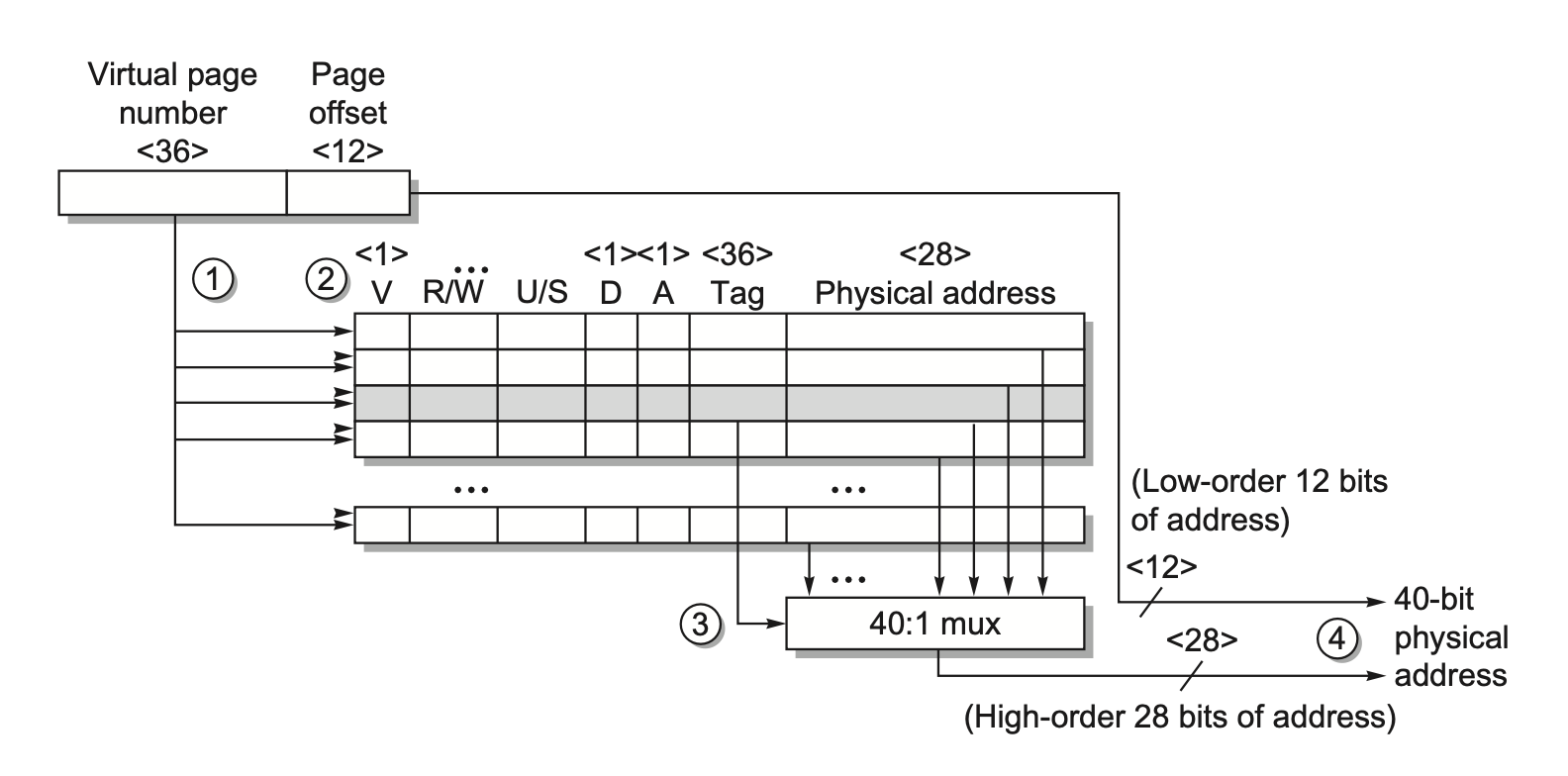 TLB 的结构类似高速缓存:它的标签位用于保存虚拟地址;而数据位用于保存物理页编号,保护字段,合法位,以及可能的使用位和脏位。