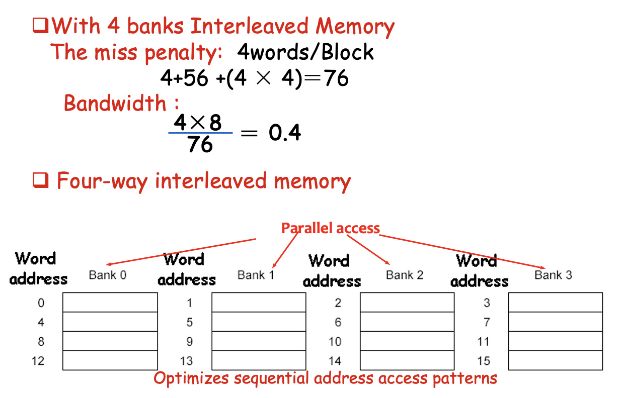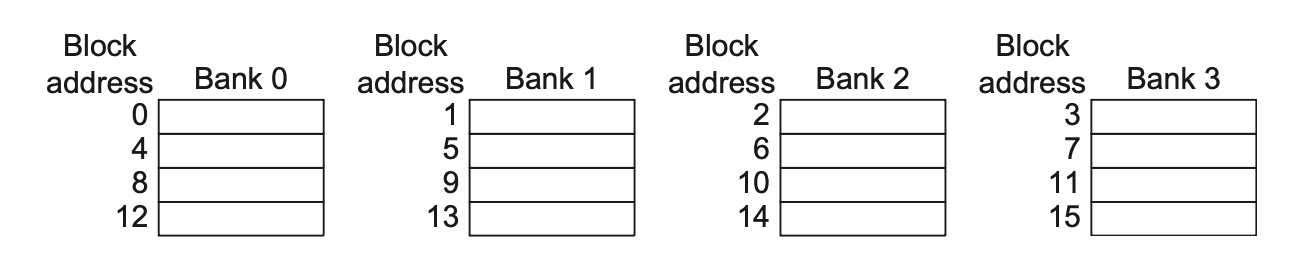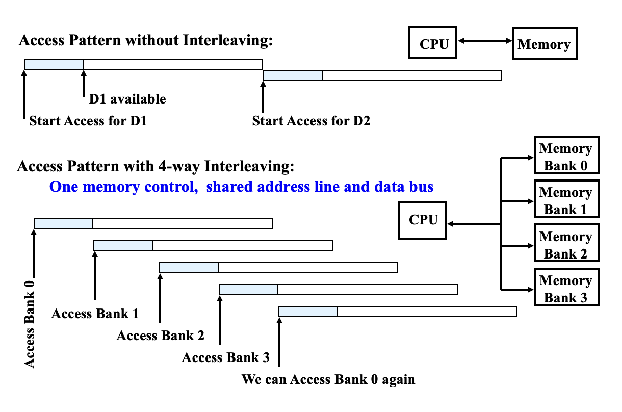 简单的交错内存:将内存组织成多个分区,可以同时读写多个字。