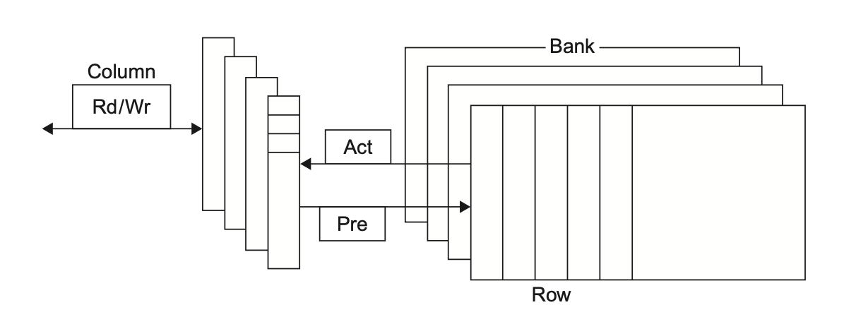 内部组织:DRAM 被组织成多个分区(bank),每个分区包含行和列。访问数据需要激活行(ACT 命令