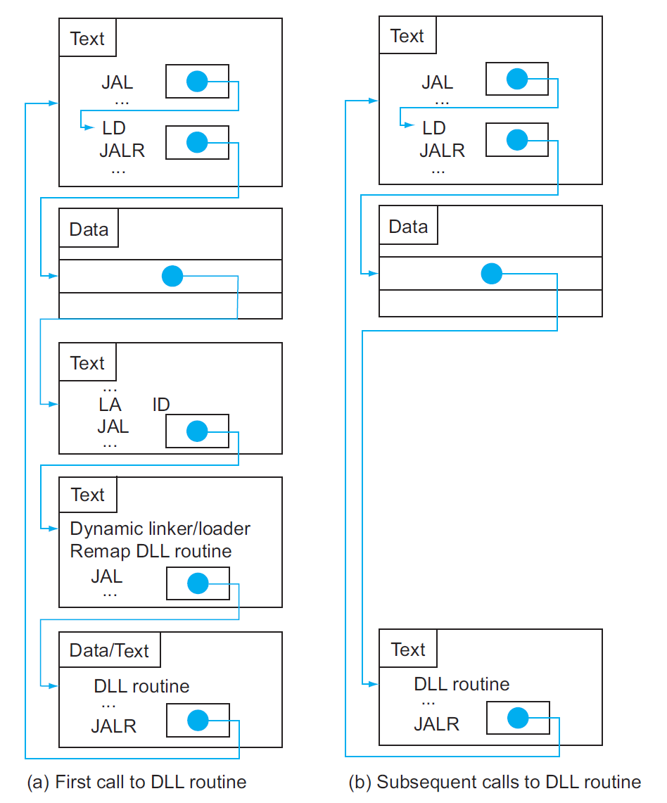 • 在原始版本的 DLL 中,程序和库都需要保留额外的信息,用于定位非局部的过程;加载器会运行一个动态的链接器,使用这些额外的信息找到合适的库并更新所有的外部引用