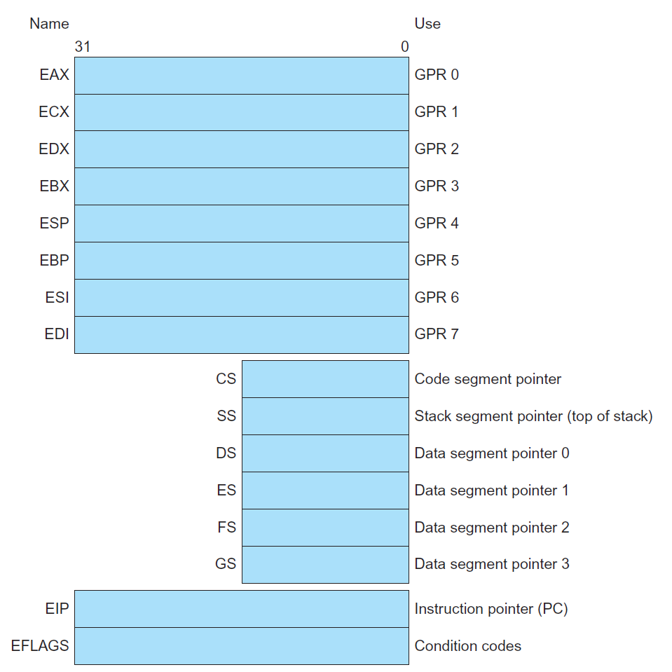 8086 指令集仅支持字节(8 位)和字(16 位,注意 RISC-V 的字是 32 位)类型的数据,而 80386 增加了 32 位地址和数据(双字,注意 RISC-V 的双字是 64