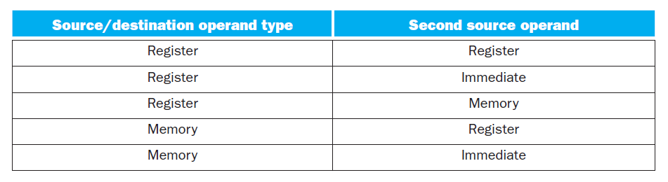 • x86 指令的其中一个操作数可以是内存,下面的表格展示了 x86 中所有可能的操作数搭配