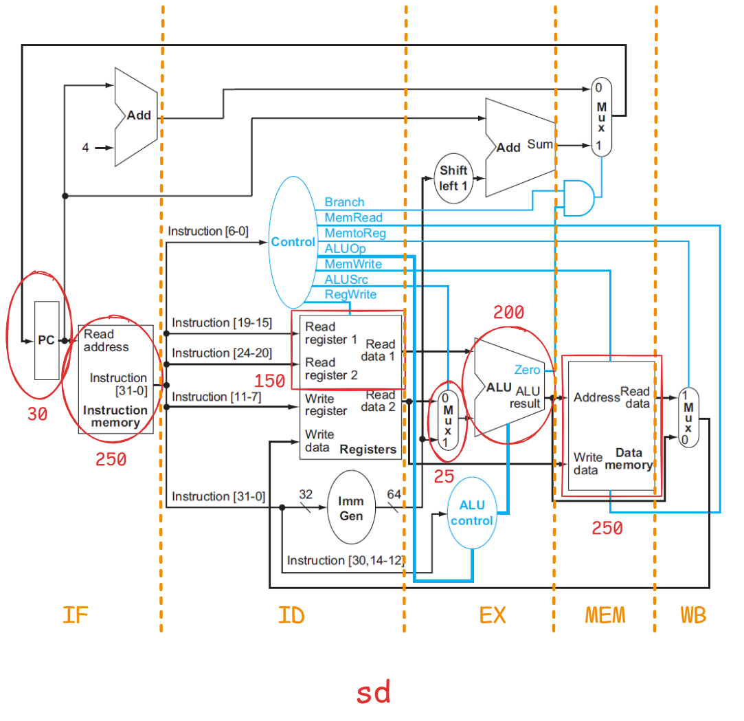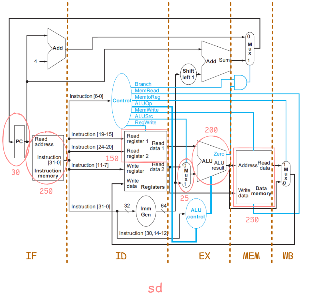 ld)和写(sd)的控制输入,分别为MemRead和MemWrite- 内存的读取需要控制信号的原因是:并不是所有指令都会有访存操作,而且访存耗时较长,所以那些用不到内存值的指令就不应该读取内存数据,因此需要控制信号来关闭这扇门;而所有指令都要从寄存器堆里读取数据,因此寄存器堆的读取无需控制信号