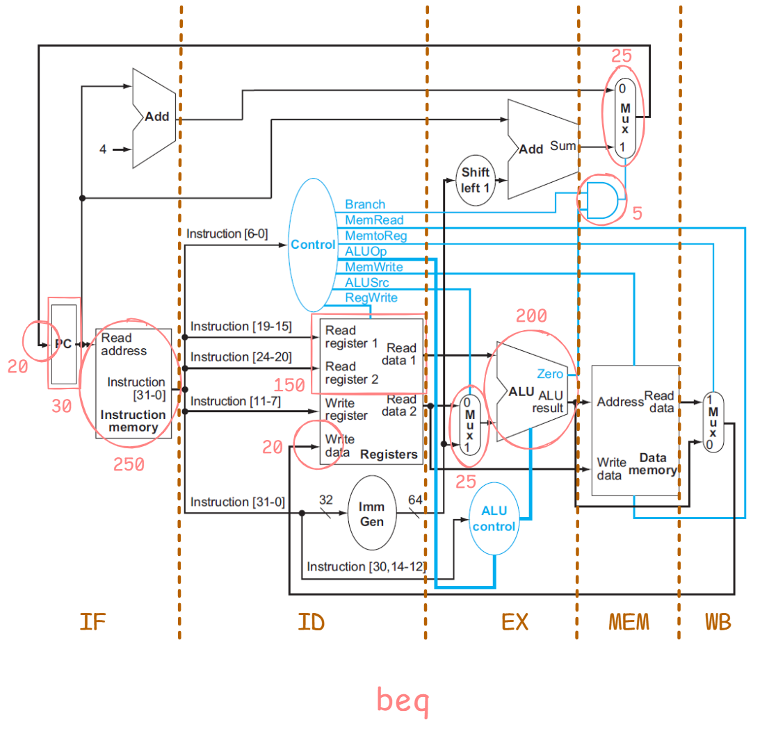 beq,只有当 ALU(减法)结果为 0(表明两数相等) ,且控制单元的信号Branch = 1时,PC 的值为指定的跳转地址 - 根据数逻的知识,我们可以将图中出现的元件归个类: