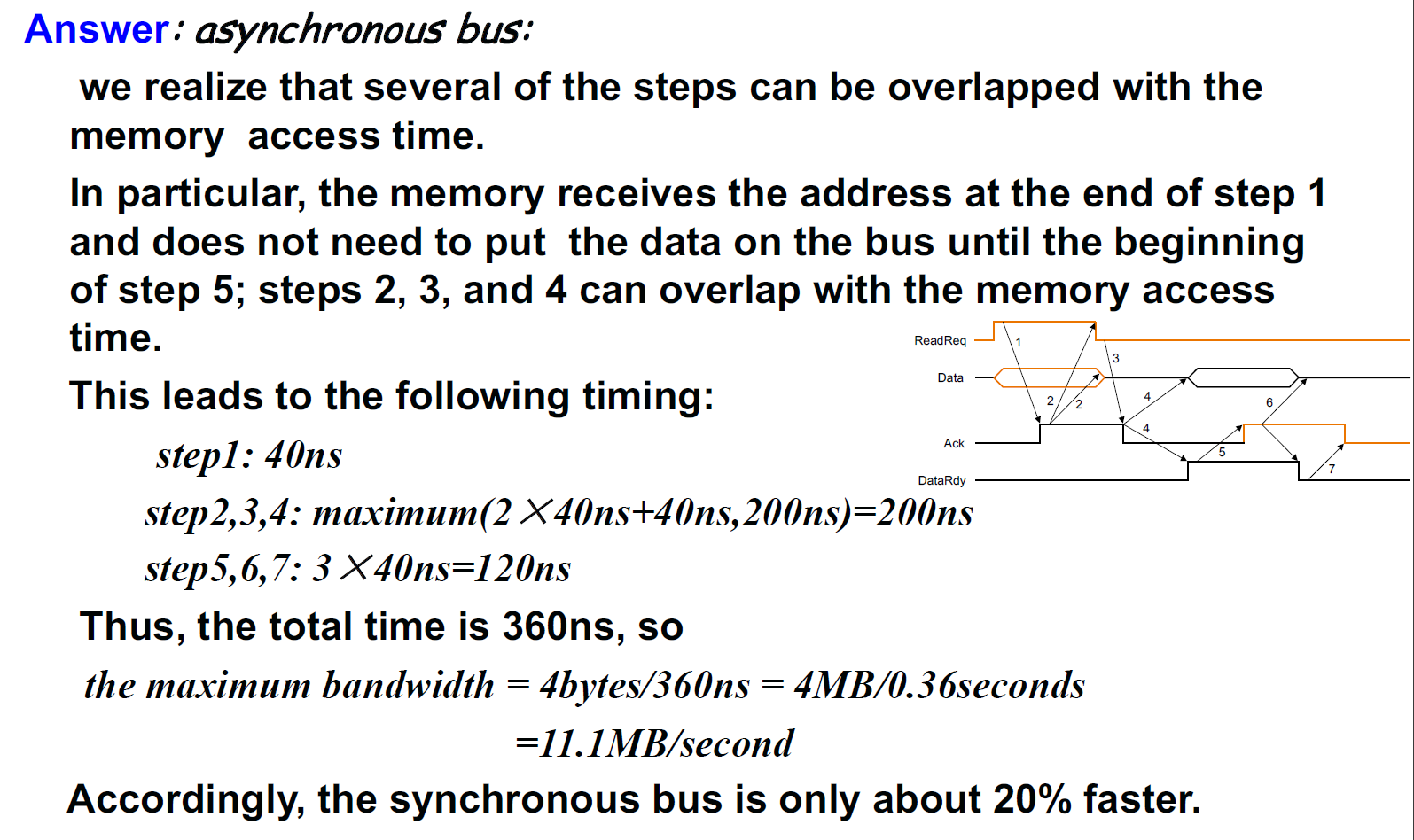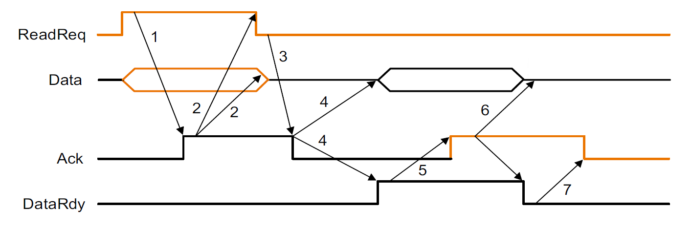 • 异步总线:不用时钟,而采用握手协议 (handshaking protocol)——一种用于协调异步总线传输的串行步骤,下面介绍具体过程: