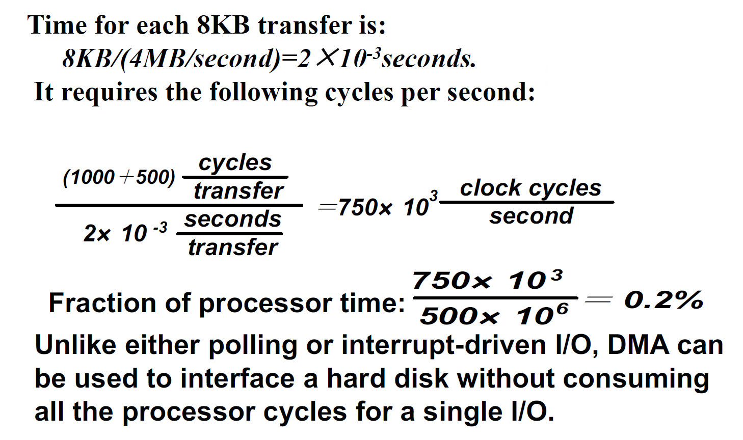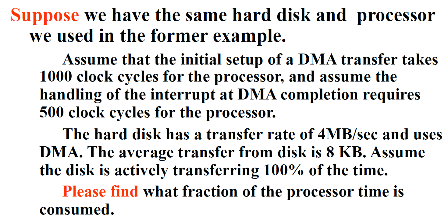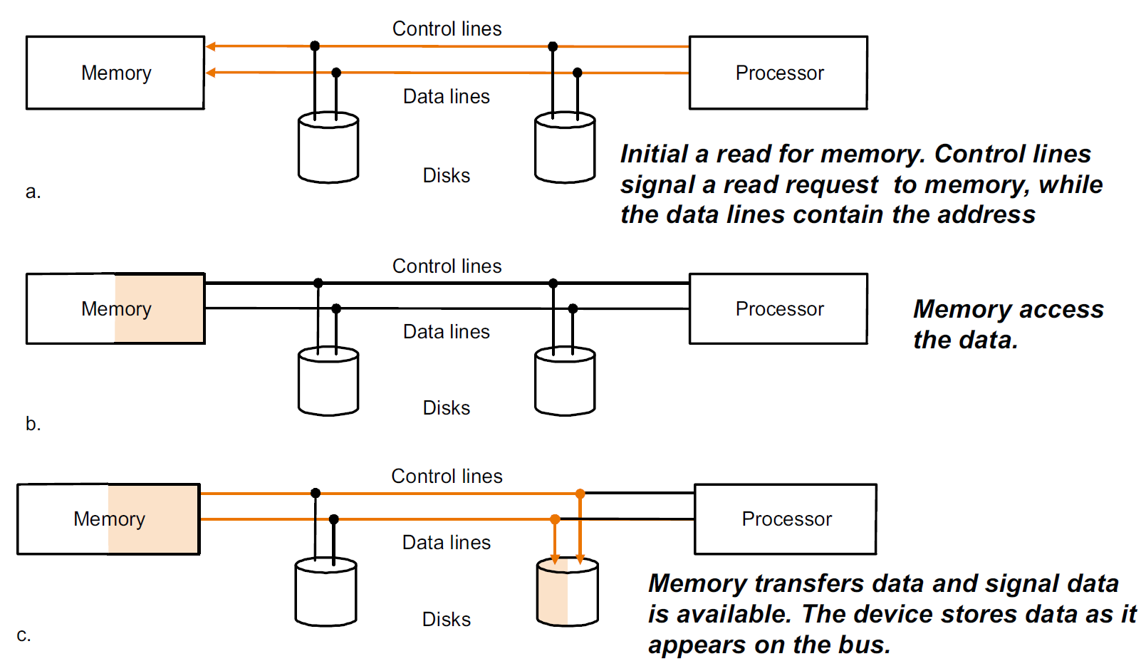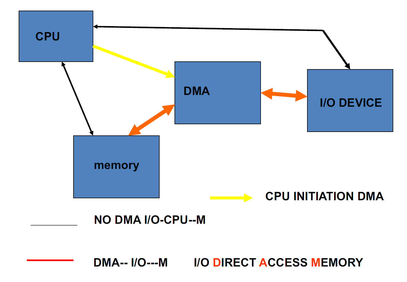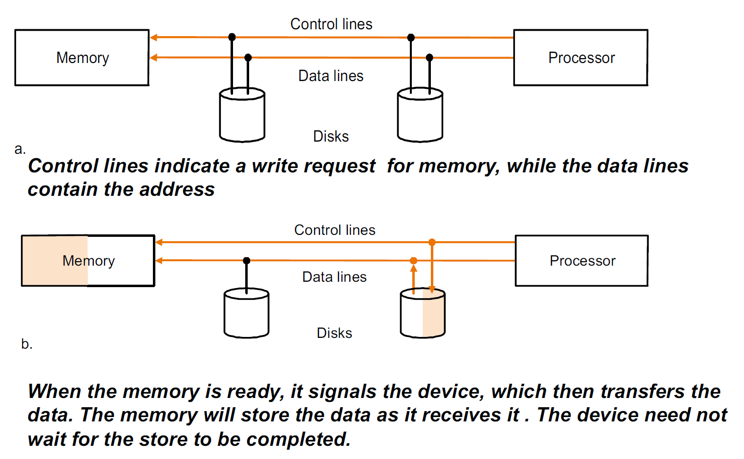 • 直接内存访问(direct memory access, DMA):设备控制器直接向 / 从内存传输数据,不需要处理器的介入
