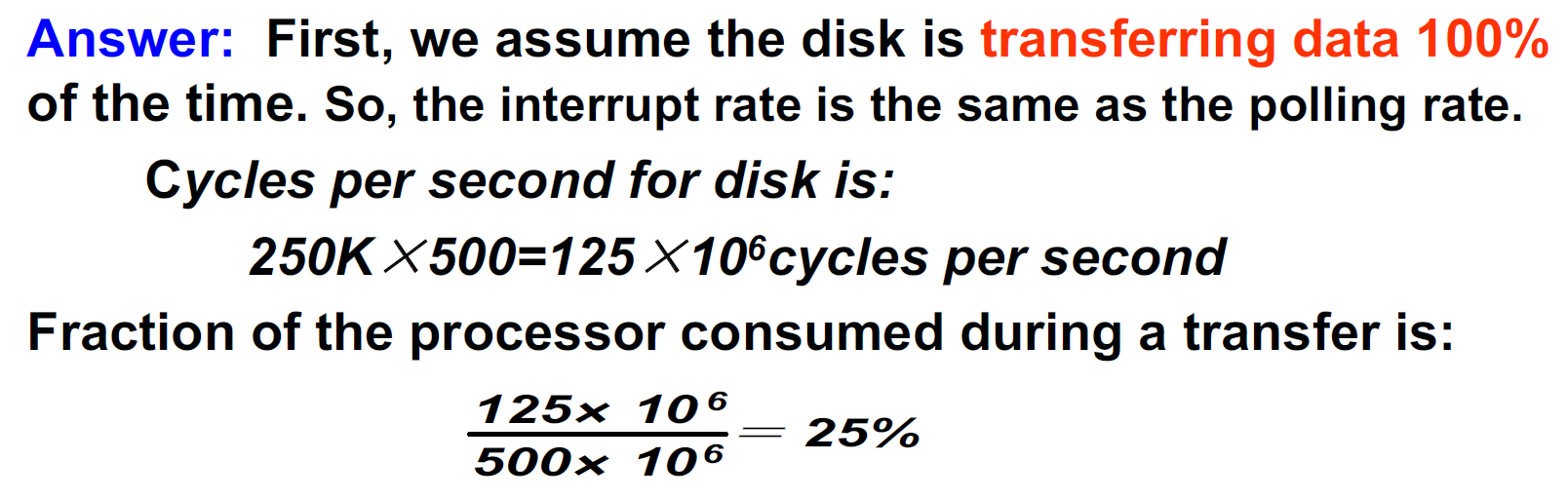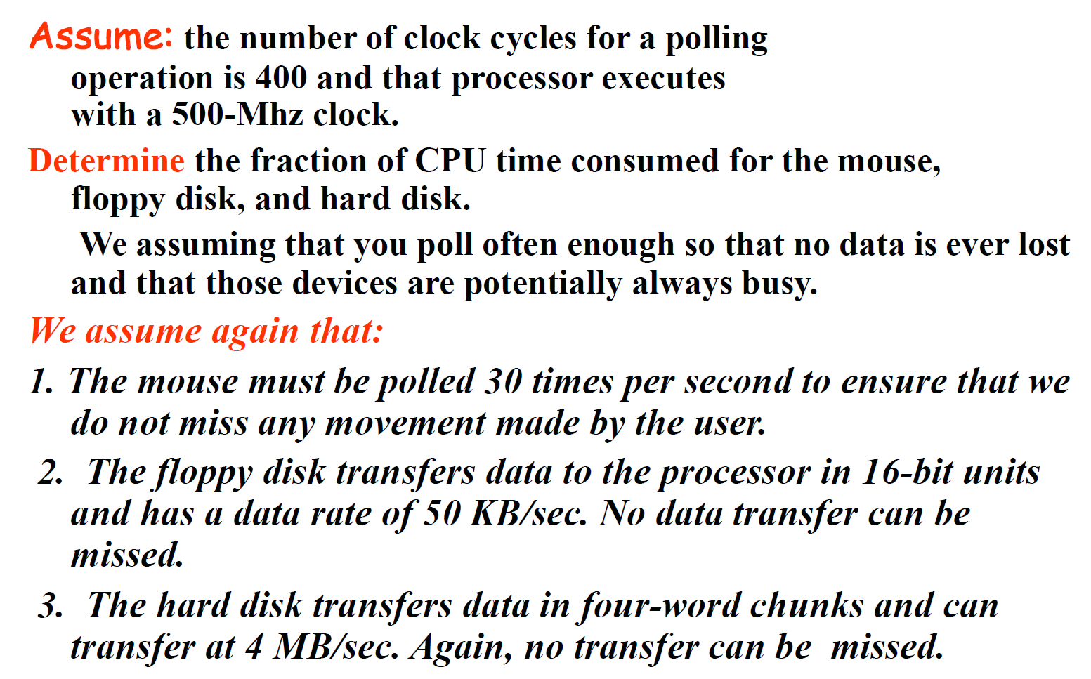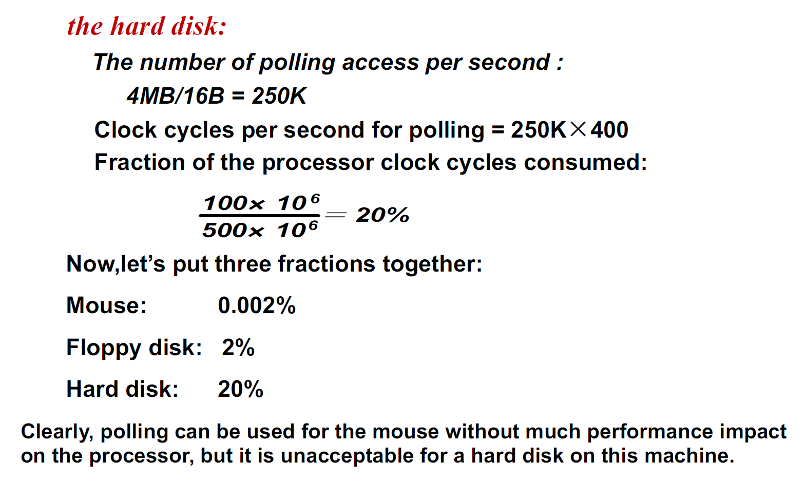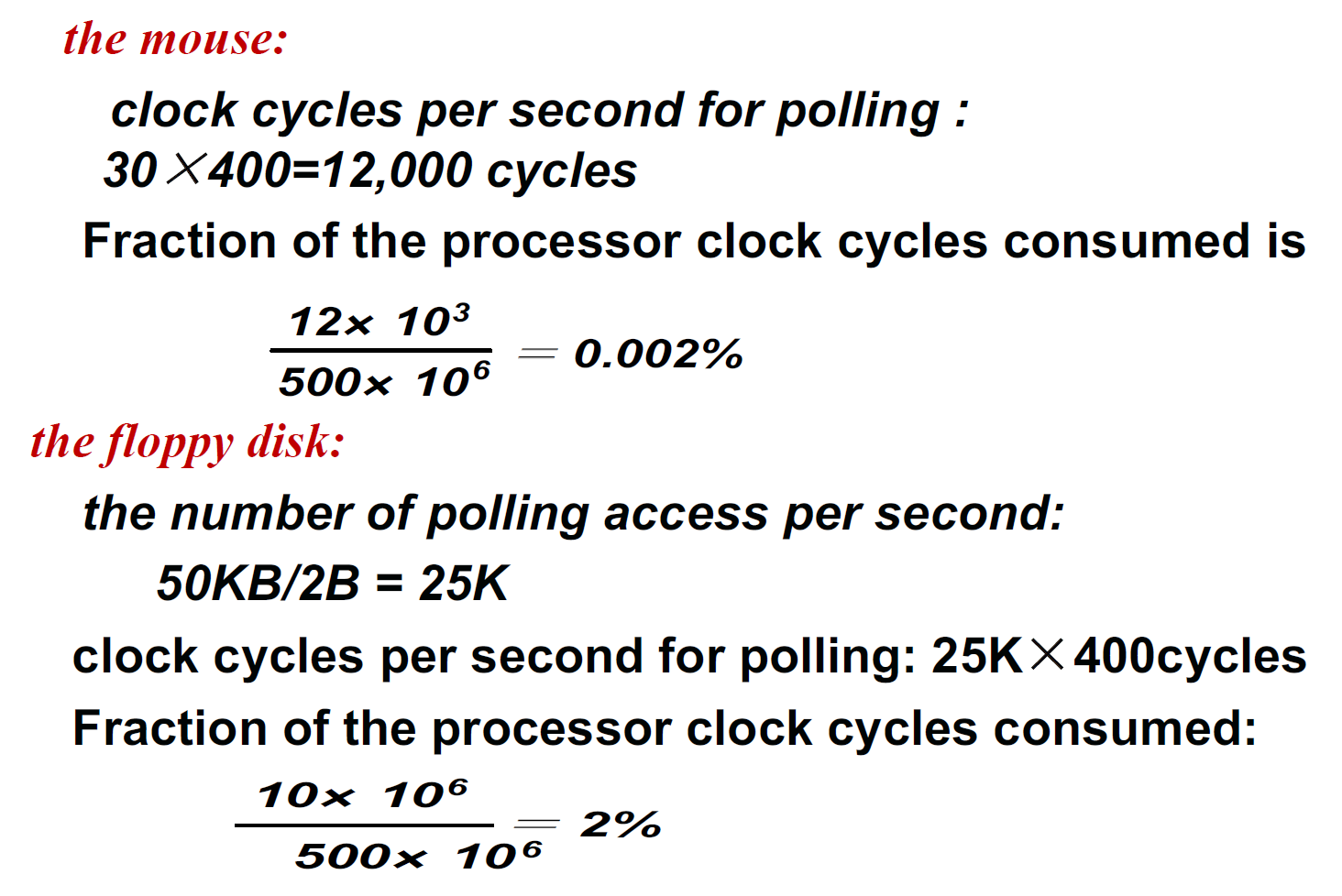 • 轮询(polling):处理器周期性地检查状态位,观察当前是否需要进行下一步 I/O 操作