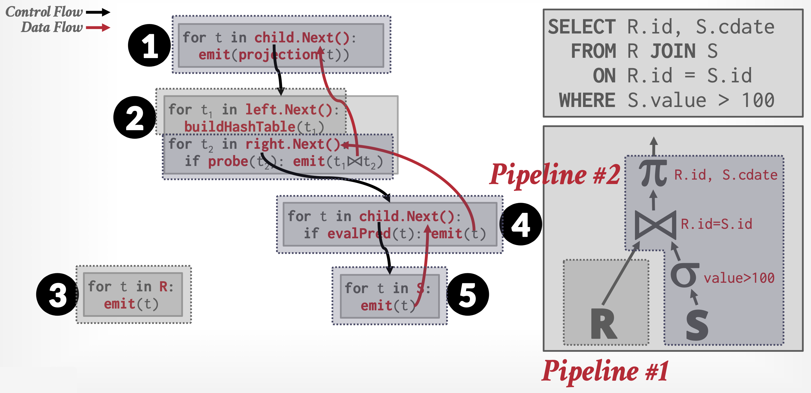 - 控制流(control flow):决定了数据库管理系统如何调用运算符