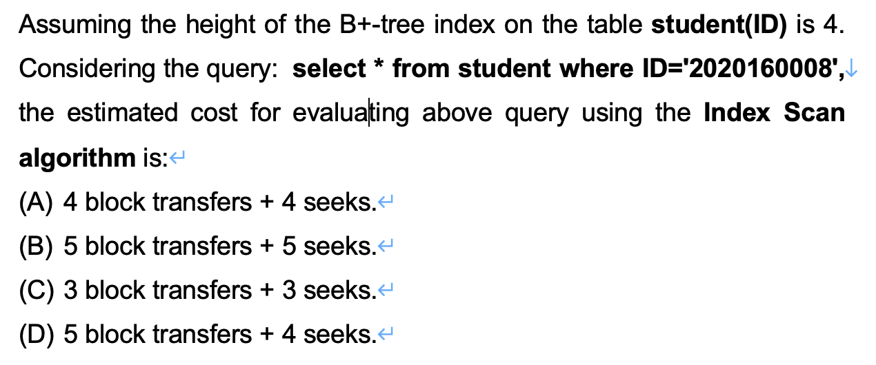 - 非键属性的相等条件:每个记录可能位于不同的块内,导致每检索一条记录需要一次 I/O 操作,而 I/O 操作包含一次寻道和一次块传输。在最坏情况下,成本为 \((h_i + n) \cdot (t_S + t_T)\),其中 \(n\) 为获取的记录数,\(h_i\) 为 B+ 树的高度,且假设每个记录都位于不同的磁盘块,且这些磁盘块是随机排序的