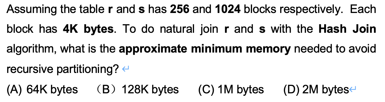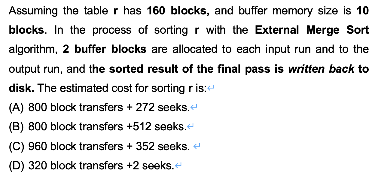 - 算法的成本取决于主存缓冲区的大小。在最好情况下,缓冲区容得下所有数据,此时无需再次访问磁盘了;在最坏情况下,缓冲区只容得下部分数据块