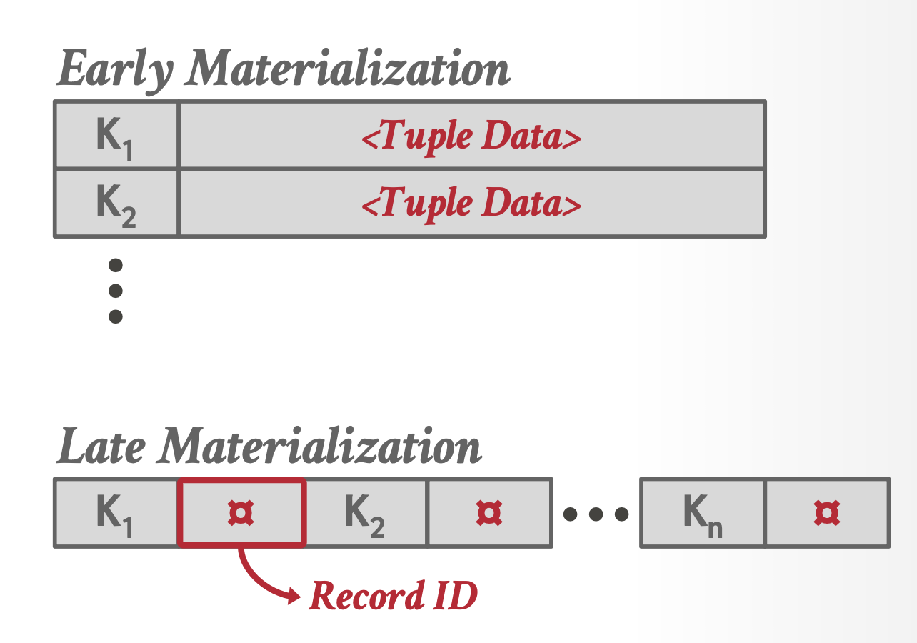 - 晚物化 (late materialization):DSM(分解存储模型)DBMS 能够延迟元组的拼接操作,直至查询计划的上层阶段。这种设计使得每个运算符仅需向下一运算符传递必要的最小信息量(例如记录 ID、列中记录的偏移位置
