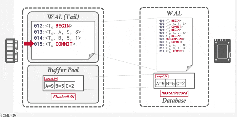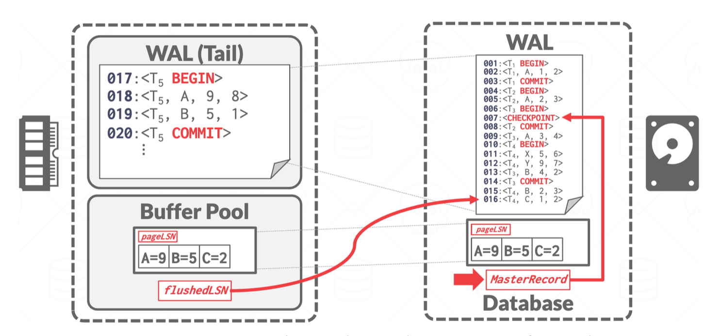 - 若不存在脏页,则将 RedoLSN 设为检查点日志记录的 LSN;重做过程从 RedoLSN 开始扫描日志(早于此点的所有日志记录均已应用到磁盘上的数据库页面