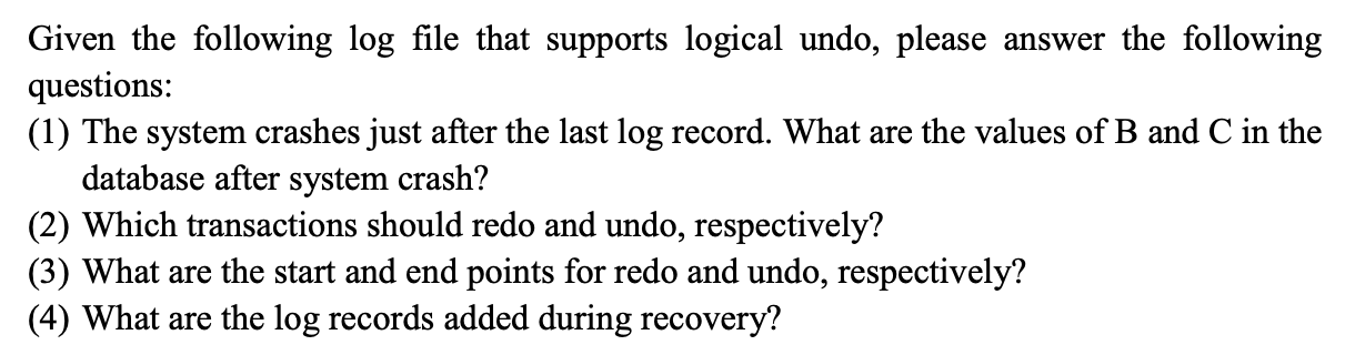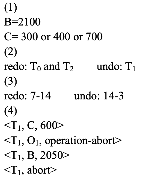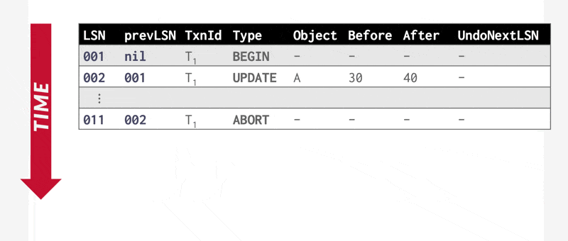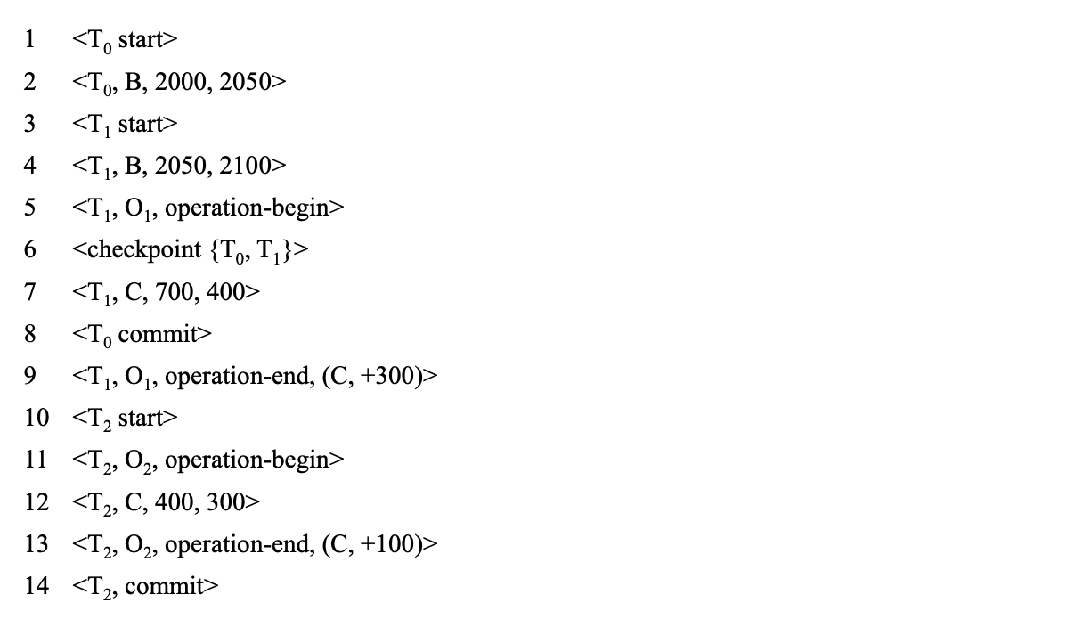 - 此外,我们还需要保存和被修改数据项的旧值相关的信息,因为当执行该修改的事务失败(中止)时,该信息可帮助我们撤销失败事务所造成的更改。