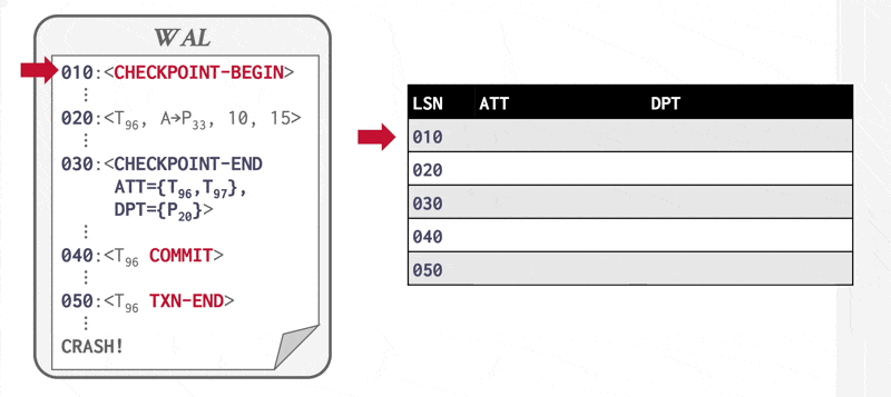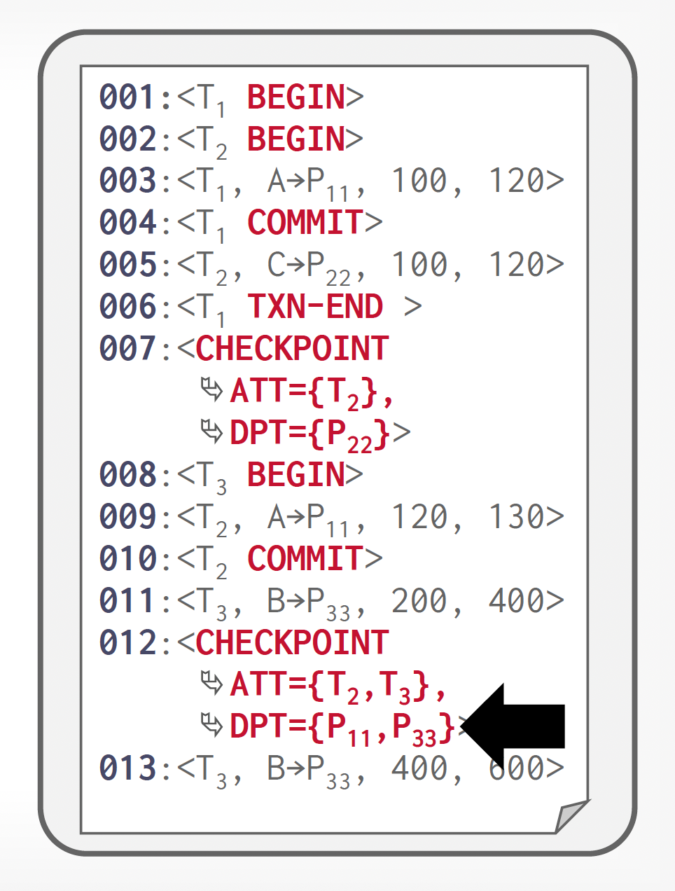 - 分析阶段会找到最后一个完整的检查点日志记录,并从该记录中读取 DPT。