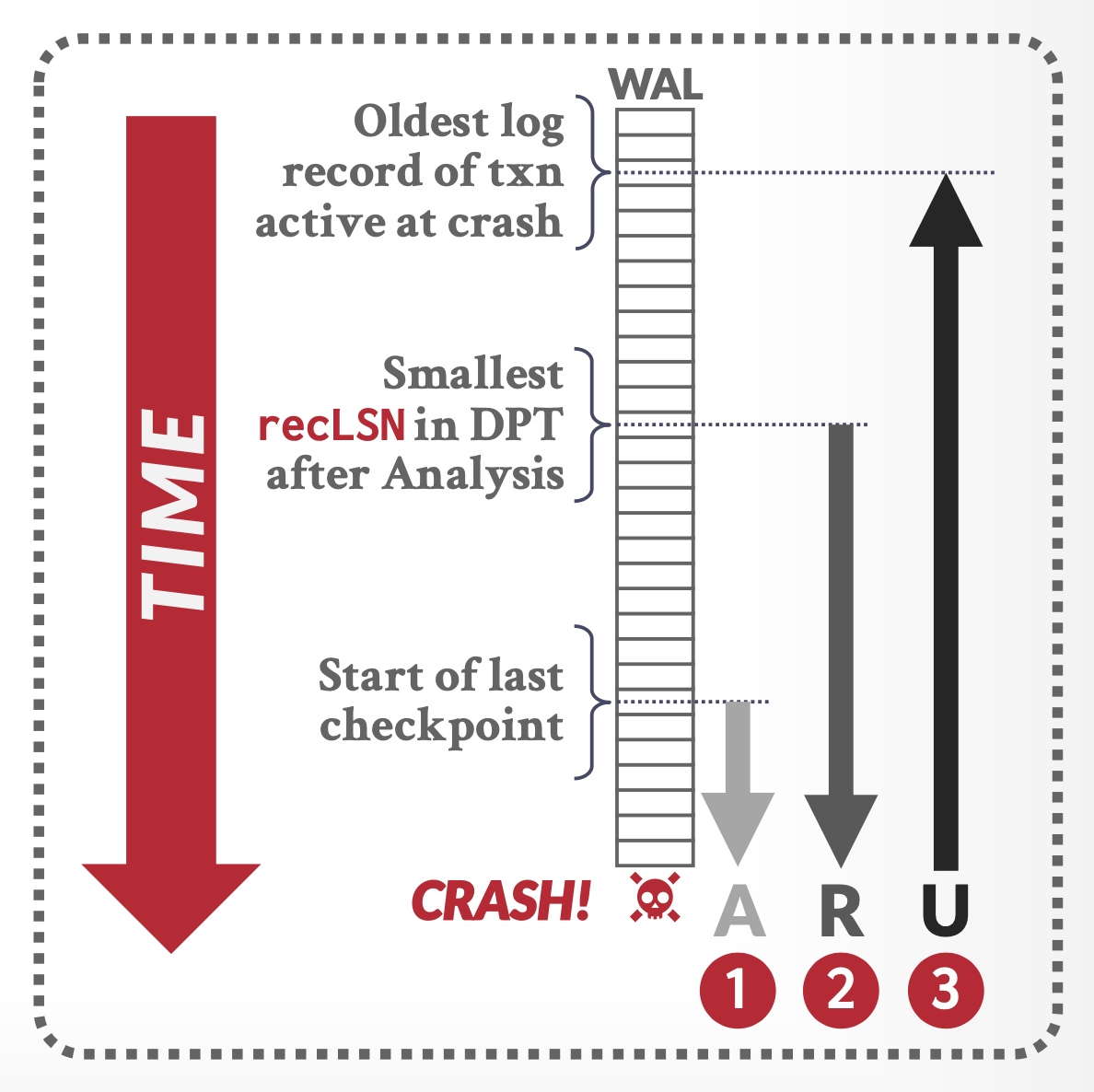- 随后将 RedoLSN 设置为 DPT 中所有页的 RecLSN 中的最小值。