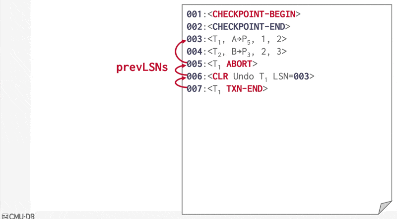 - 在 ARIES 中,通过创建一个虚拟的 CLR 来实现此类操作,其 UndoNextLSN 的设置使得事务回滚时跳过由该操作生成的日志记录。