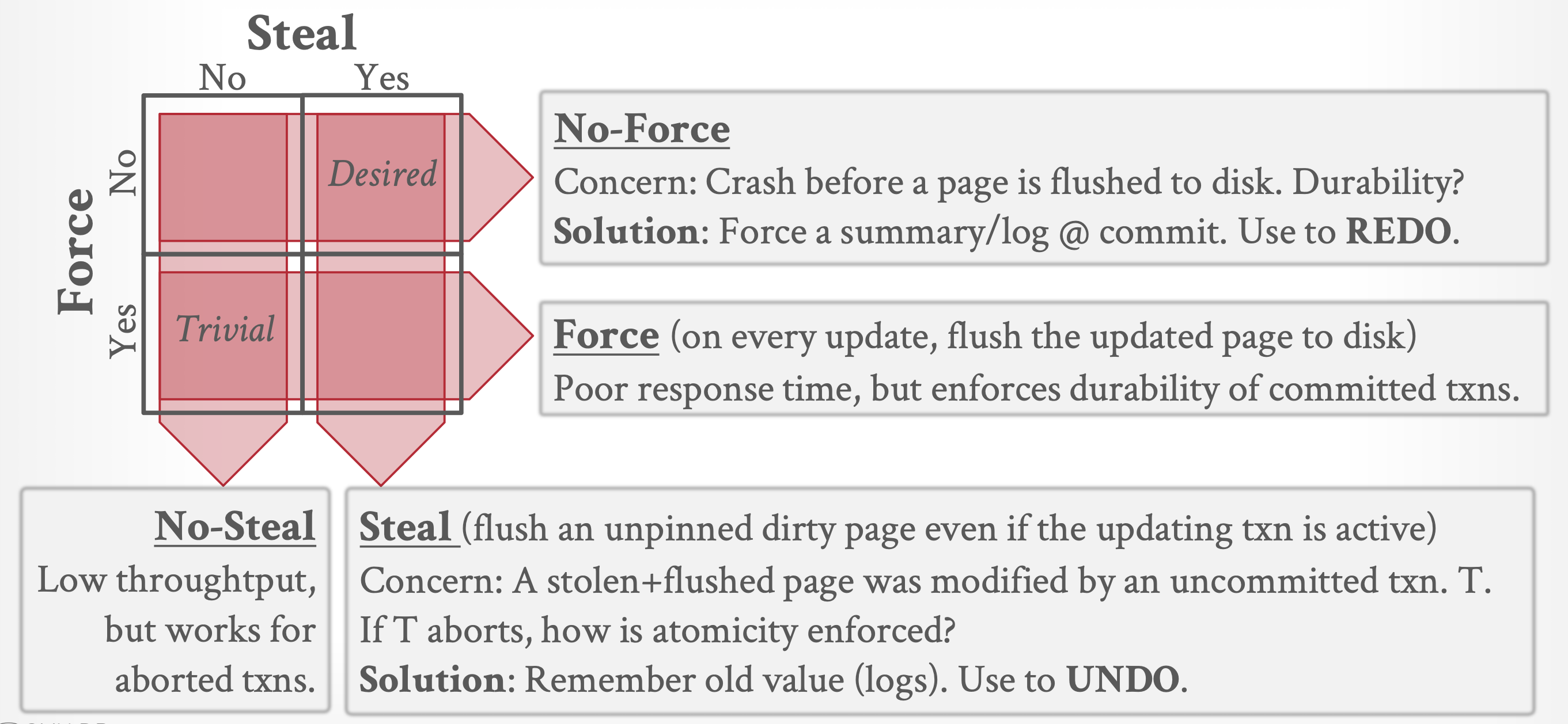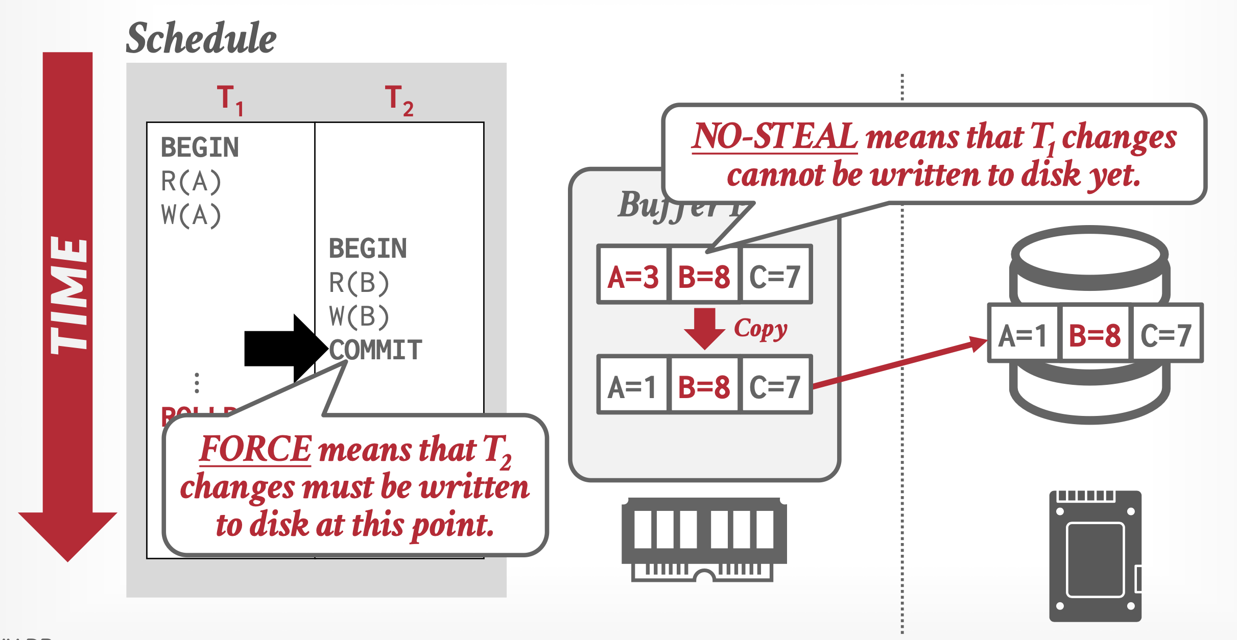 缓存块最终会被写入磁盘中,因为缓冲区管理器需要将内存空间用于其他地方,或者数据库系统希望将缓存块的变更同步到磁盘上。当数据库系统发出 output(B) 指令时,我们称其对缓冲区 B 执行了强制写(force-output) 操作。