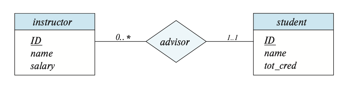 在 E-R 图中,我们还可以指明更为复杂的约束——可以在线条上标注 l..h,其中 l, h 分别表示最小和最大基数。如果 h = *,表明没有最大限制;若 l = h = 1,则表示的是一对一的关系。