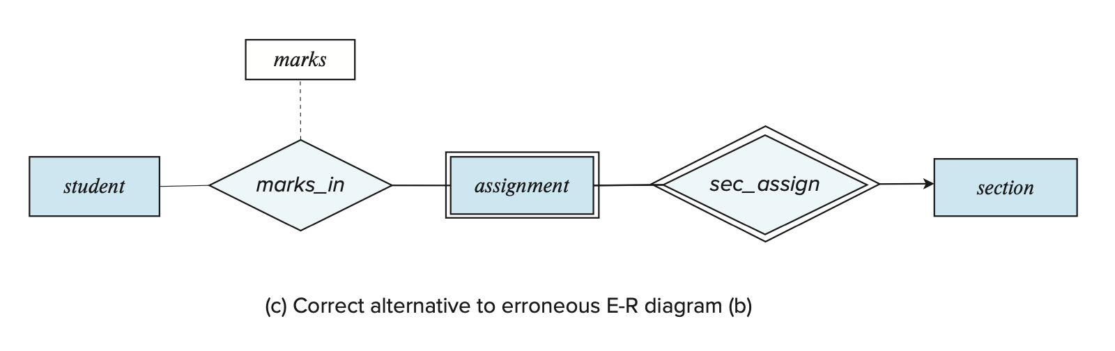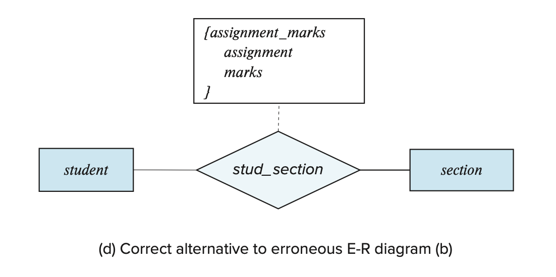 对于某个联系,在需要用到多值属性的时候仍然选择使用单值属性(如下图所示,mark 属性可以有多个值