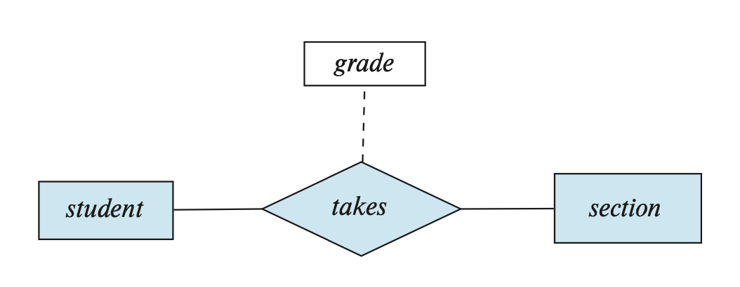 联系也可能有一组属性,被称为描述属性(descriptive attributes),在 E-R 图中用一个单独的矩形表示,并且用虚线与菱形相连,如下图所示(注意 grade 才是属性,其他矩形表示的是实体集