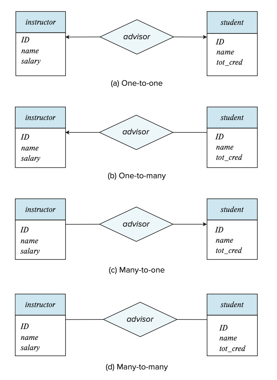 有以下几类映射基数(假设在实体集 \(A, B\) 之间有一个联系集 \(R\)
