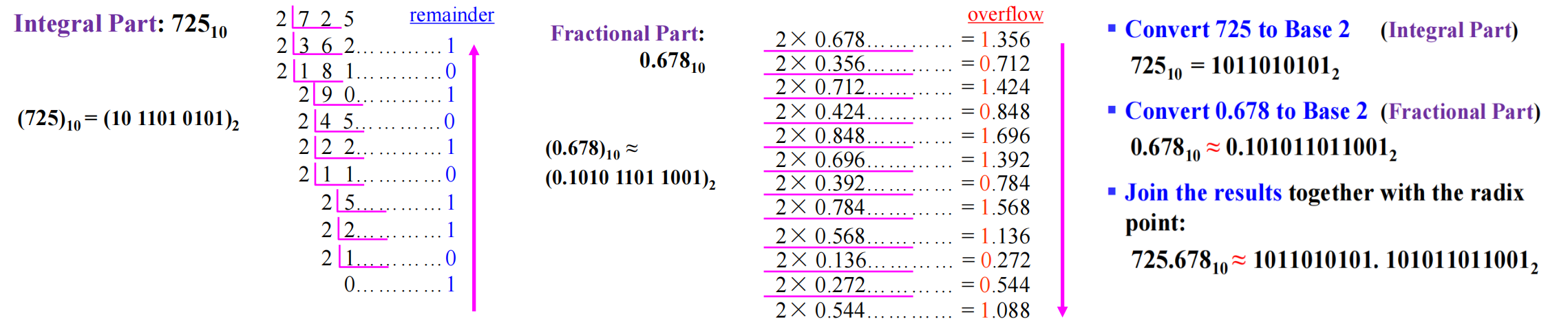 🌰:将 \((725.678)_{10}\) 用二进制表示