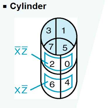 有些方块看似不相邻,但如果采用“按对相邻环 (pairwise adjacent ring)”的概念,将 K-map“卷”起来,形成一个圆柱,那么两边的方块就会形成相邻的关系。这样的相邻也可以用来化简。