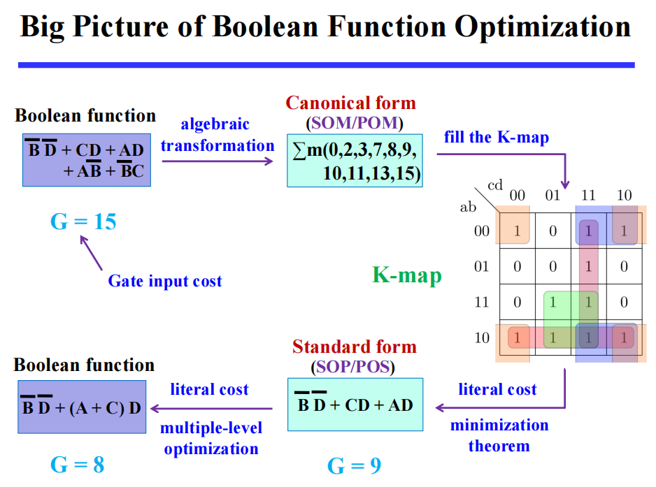 - 简化布尔方程:使得字面量 ( 包括所有未取补和取补的 ) 的数量最小