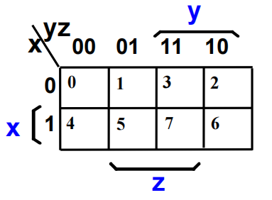 - 一个方块代表三个变量的最小项