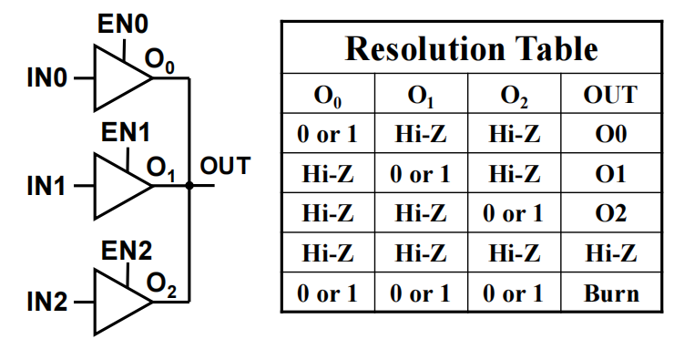 - 同一时间最多只有一个三态门处于使能状态,否则电路就会被烧坏掉