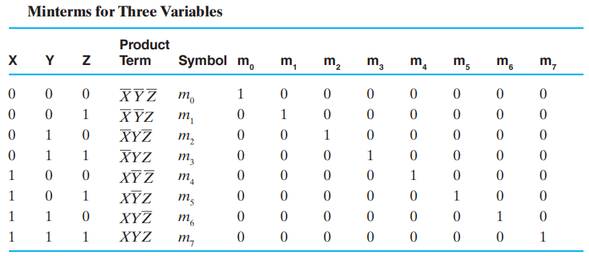 最小项 (minterms) 是所有变量 ( 不论是本身 \(X\) 还是取补 \(\overline{X}\)) 的乘积项