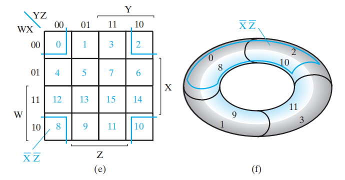 四变量 K-map 的两侧和上下也认为是“相邻”的,因此可以将 K-map 弯曲成一个甜甜圈状的物体: