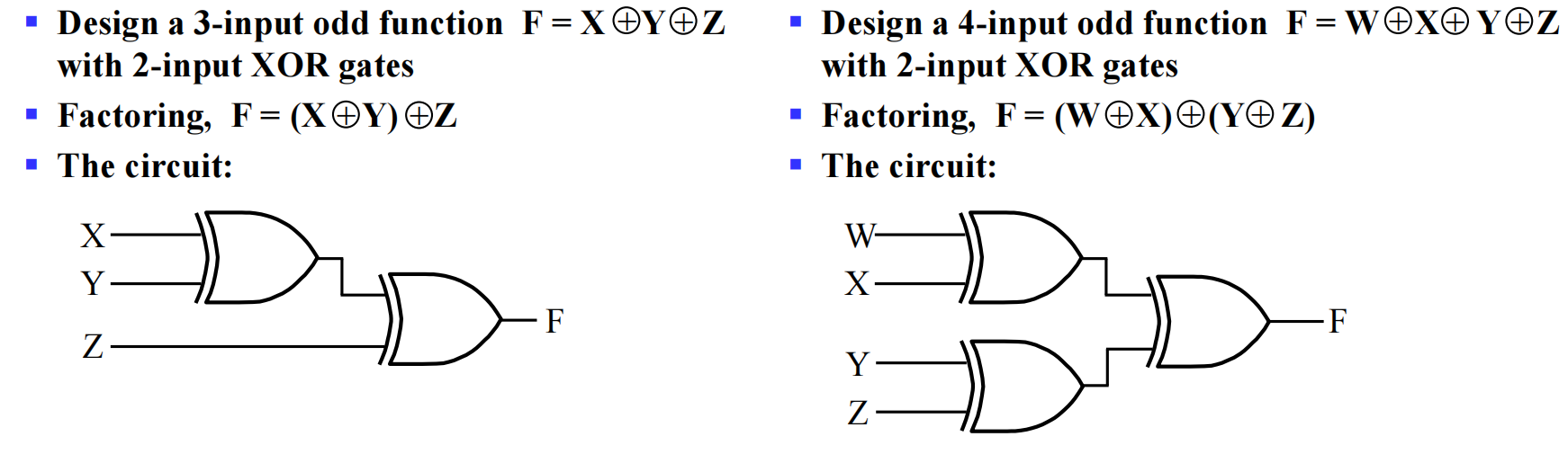 对于多个变量的异或,我们采用树状结构 (tree),将几个异或门连在一起。之所以可以这样做,是因为异或满足结合律