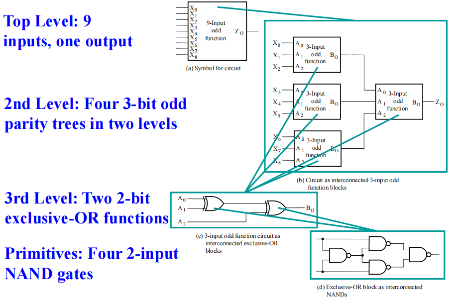 - 自底向上 (bottom-up design) 从细节的、原始的块出发,将它们结合起来,形成更大更复杂的函数块,着重于细节。它回答了:我们如何构建电路?