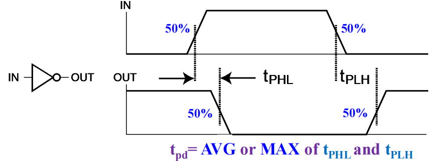 通常,我们通过输入 / 输出的高低电平的中点的延迟差来计算传播延迟,见下图