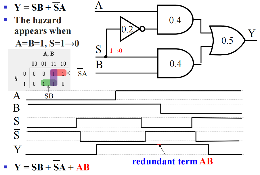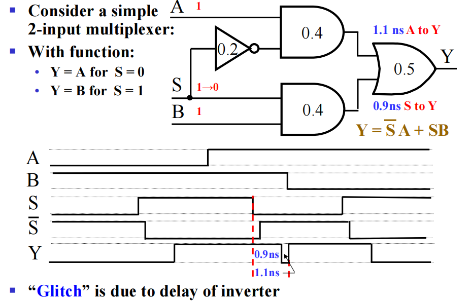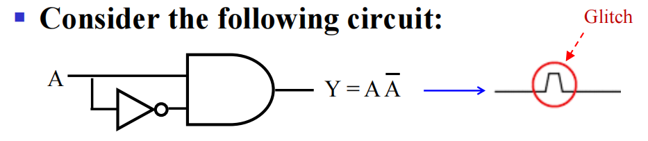 按照布尔代数的知识,我们知道 \(Y = A \overline{A} = 0\),但正因为延迟的存在,就会出现上图的毛刺 (glitch),这自然不是我们期望的结果