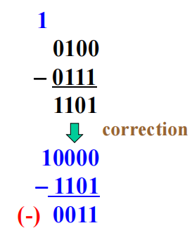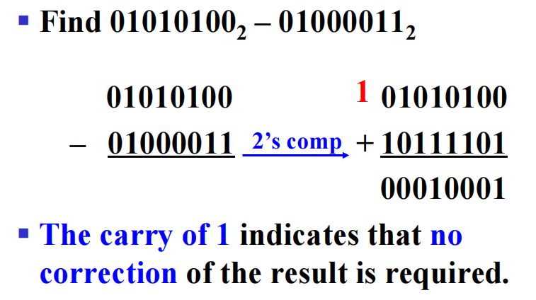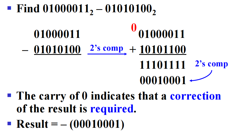 减法:减法 ( 被减数 - 减数 ) \(\rightarrow\) 被减数 + 减数的补,然后用加法的方法做即可