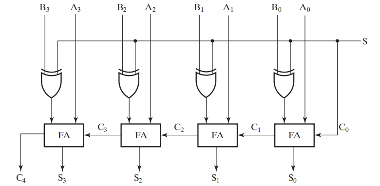 - 当 \(S = 1\) 时,此时通过异或的取反作用,加上 \(C_0 = 1\),我们得到了 B 的补码,执行减法