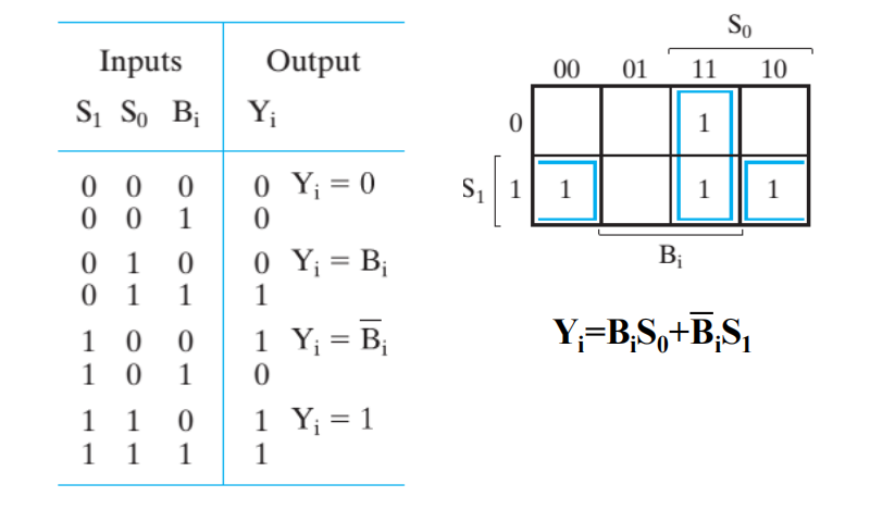 - 使用逻辑块,对加法器输入 B 的 4 种情况中进行选择