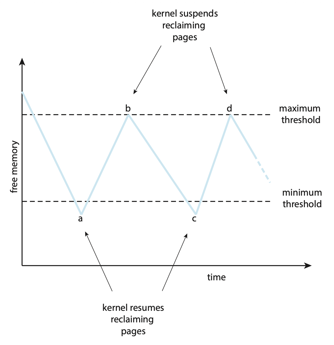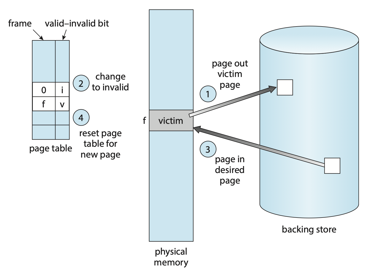 - 释放操作可通过将帧的内容写入交换空间,并通过修改页表来表示该页已不在内存中实现