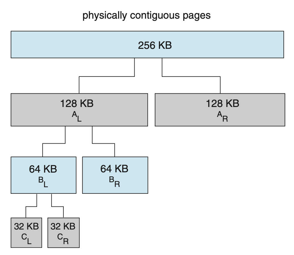 - 由于从 21 KB 开始下一个最高的 2 的幂是 32 KB,因此 \(B_L\) 或 \(B_R\) 再次被分成两个 32 KB 的伙伴 \(C_L, C_R\),这些伙伴中的一个用于满足 21 KB 的请求