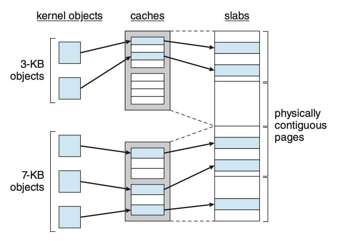 - 当需要一个新的内核数据结构对象时,分配器可以从缓存中分配任何空闲对象以满足请求;从缓存中分配的对象被标记为已使用(